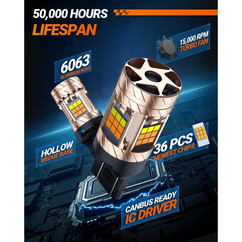 【 White & Amber Switchback 】Each 7443 light bulb is equipped with 36 J3 latest chips, including 12 white light chips and 24 yellow light chips. Then, two colors can be switched through intelligent driving. Amber/yellow is used for front turn signals, and white is used for daytime running lights.