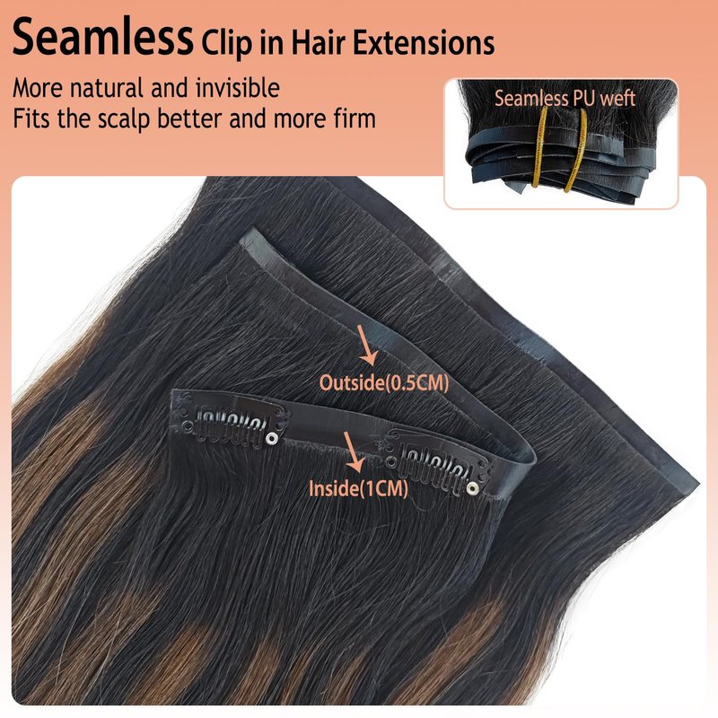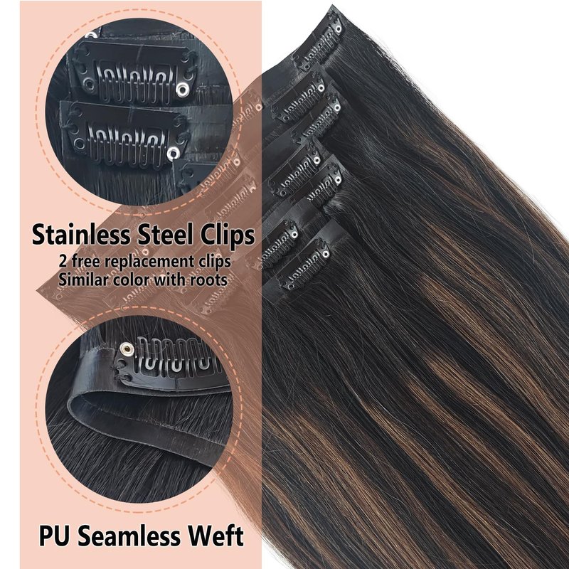 - đăComfortable & Easy to WearăWater-proof PU clip in hair extensions use the latest seamless skin-weft technology, soft, comfortable, and gentle on your scalp. Stainles steel clips ware sewed stably, covered with a layer of soft rubber to carefully protect your scalp and hair, you can easily apply and remove it by yourself.