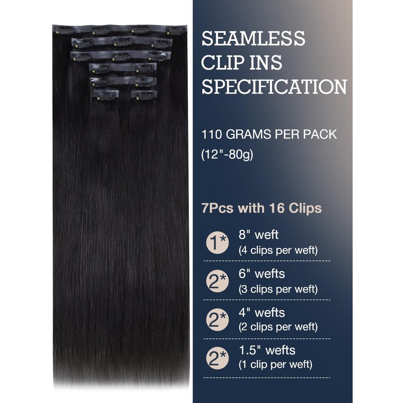 - Clip in Hair Extensions Specification: Our seamless clip in human hair extension has a variety of curves, straight, kinky straight, yaki straight, body waves. Details: 7pcs. Weight and Size Specification: 12 inch-80g, 14-24 inch-110g. You can choose any curved and size you like.