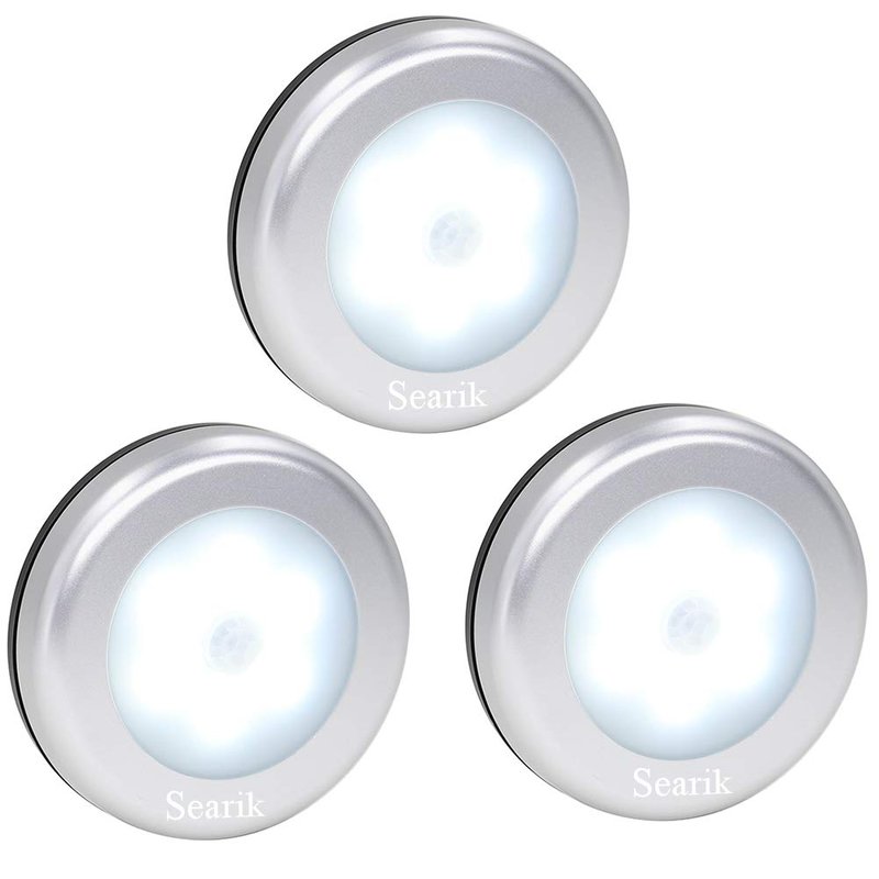 Searik sensor night lights motion activation with 6 leds is battery powered and can turn on automatically when it's in dark and motion detected. The night lights motion sensor are sent with adhesive tape, which is easy to stick anywhere and also built-in magnet can stick at any metal surface.