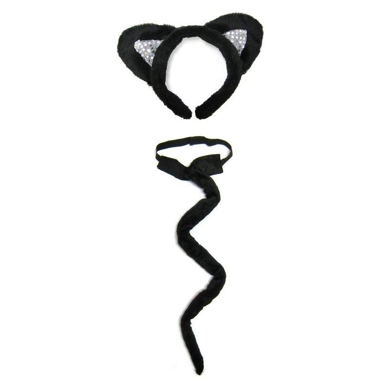 SeasonsTrading Deluxe Black Sequin Cat Ears & Long Tail Costume Set - Party Kit