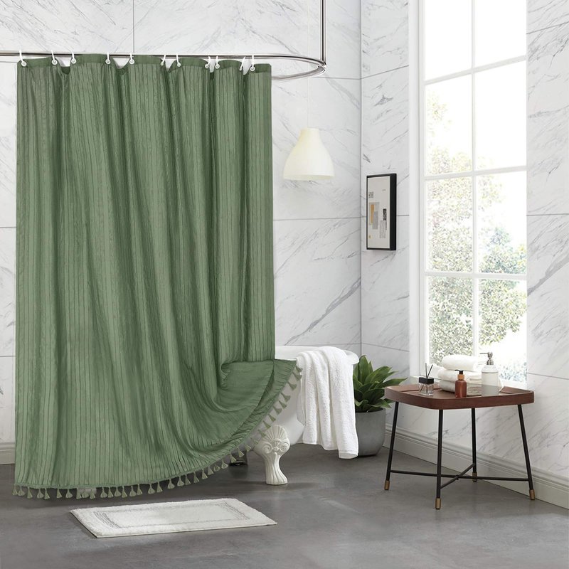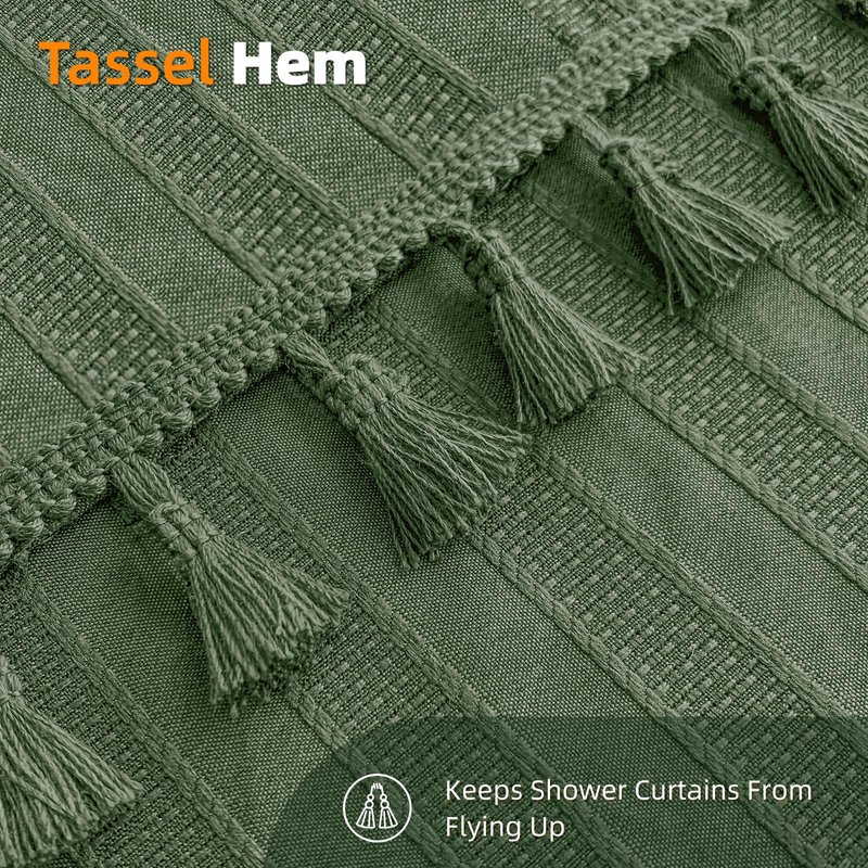 Seasonwood Boho Green Shower Curtain for Bathroom 72 X 72 Inches Textured Vertical Stripe Tassel Shower Curtain Farmhouse Minimalist Cute Shower Curtain Green