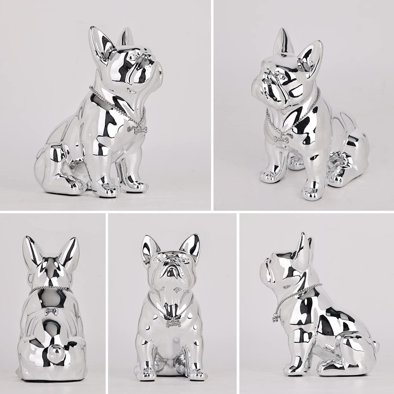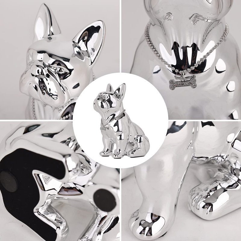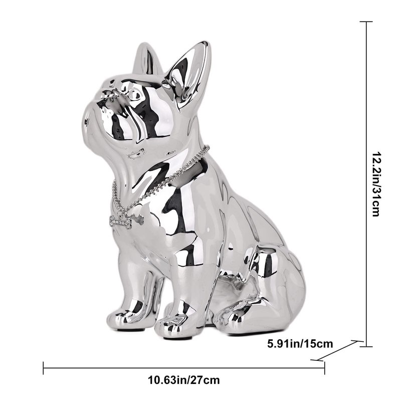 - This resin French Bulldog, with its lustrous electroplated silver coating, is not just a decorative piece but also a symbol of guardianship for your home. Each detail is crafted to perfection, from the poised ears to the gentle gaze, capturing the bulldog’s spirit in a form that's both strong and heartwarming. The included jewel necklace accessory adds a touch of opulence, making it stand out in any setting.