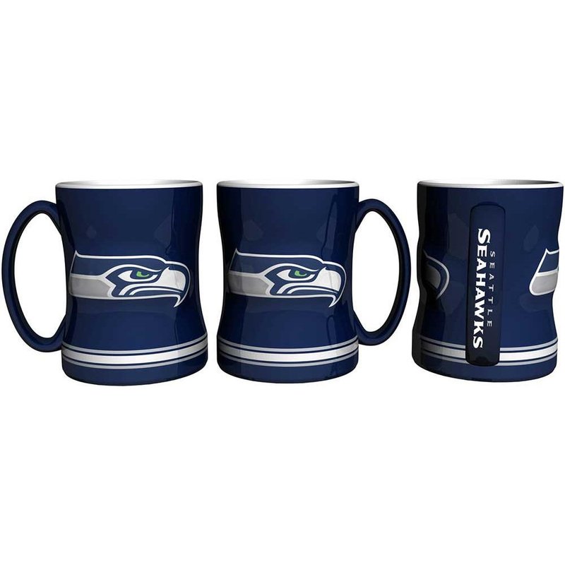 The sculpted coffee mug is decorated with your team's bright and colorful graphics. The team logo is on both sides, and is slightly raised. The mug also features the team's name on the handle and is made of ceramic. It holds 14 ounces of fluid and is microwave & dishwasher safe. Approximately 4.5" tall. Made By Boelter Brands