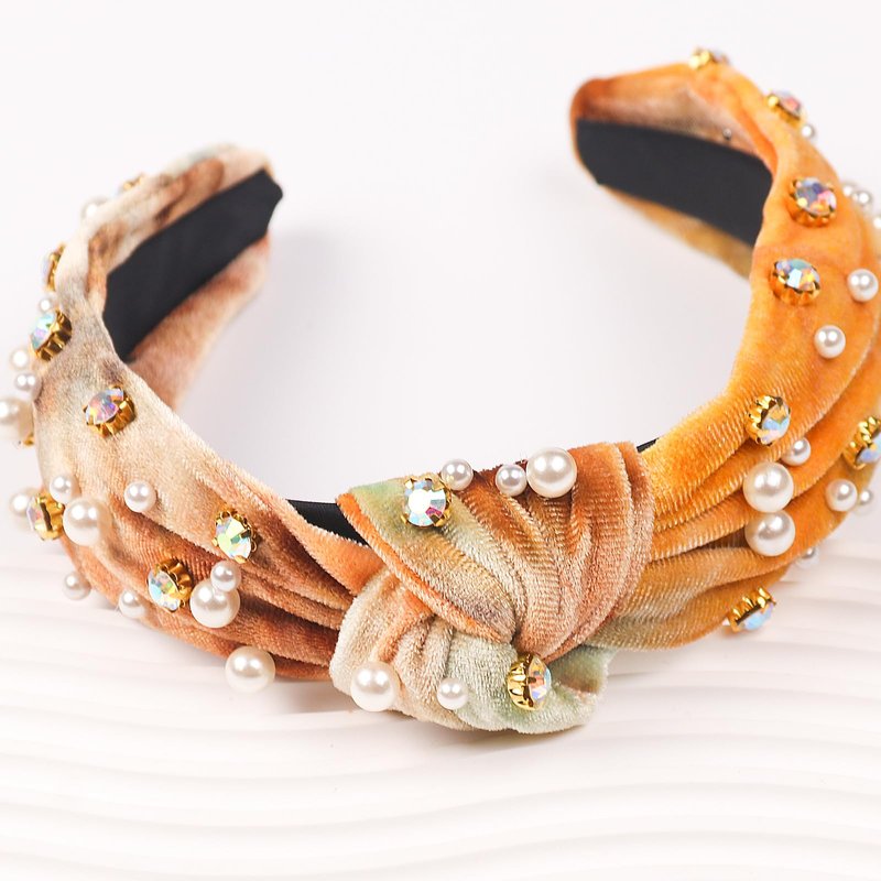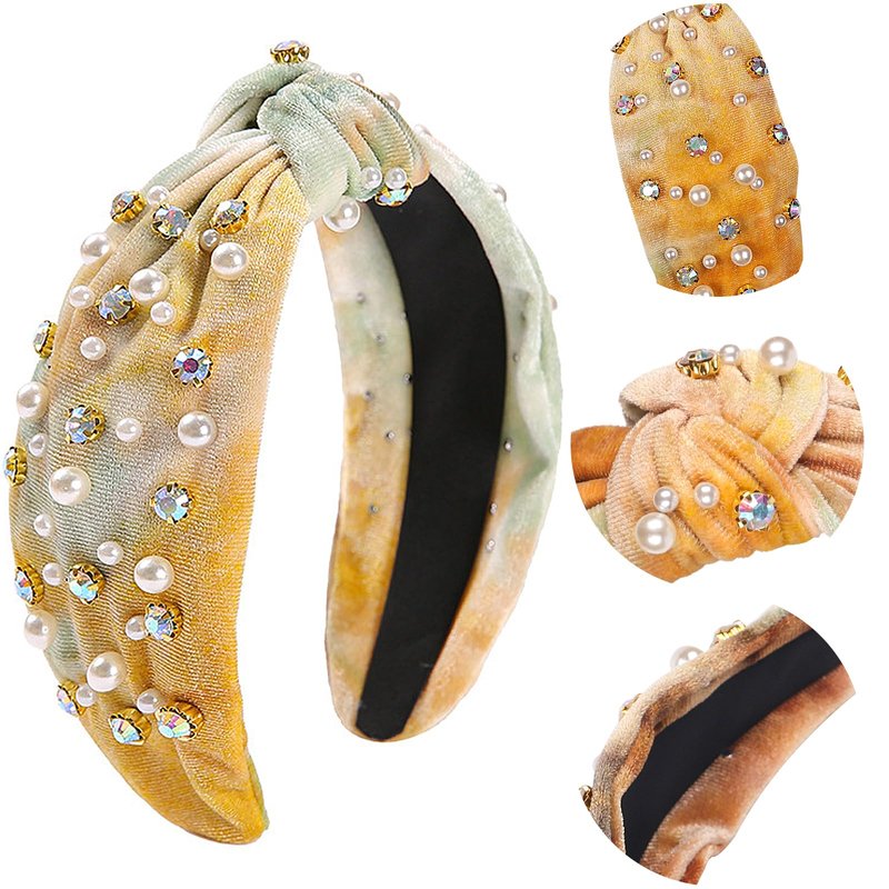 SeBneny Tie Dye Pearl Headband Crystal Rhinestone Headbands for Girls, Khaki Velvet Top Knotted Hairband Head Bopper Non Slip Wide Headband for Party Supplies Headwear 1PCS