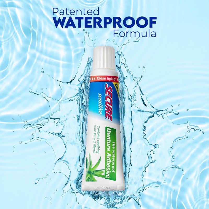 - PATENTED WATERPROOF ADHESIVE: Our denture cream offers a solid bond up to 12-hours. It is also non-water soluble which keeps out any liquid and food particles. Perfect for new denture wearers and those with sensitive gums, it ensures dentures stay put, eliminating slipping and sliding. Enjoy natural denture comfort with no reapplication after meals or drinks.