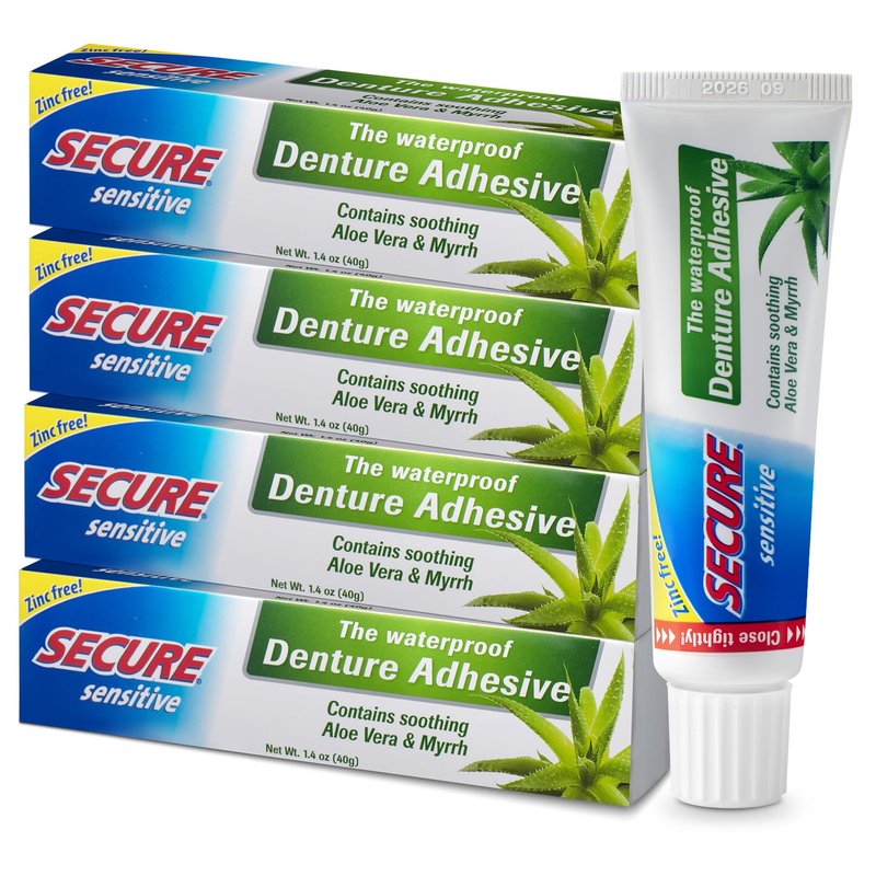 Secure Sensitive Gums Waterproof Denture Adhesive Zinc Free with Aloe Vera & Myrrh - Extra Strong 12 Hour Hold - 1.4 oz (Pack of 4)