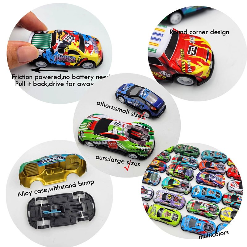 - Friction Powered Race Cars: Just pull it back ,the alloy race cars will automatically go faraway.with brightly colors and round corner desgin,no burrs,it won't hurt your hands.
