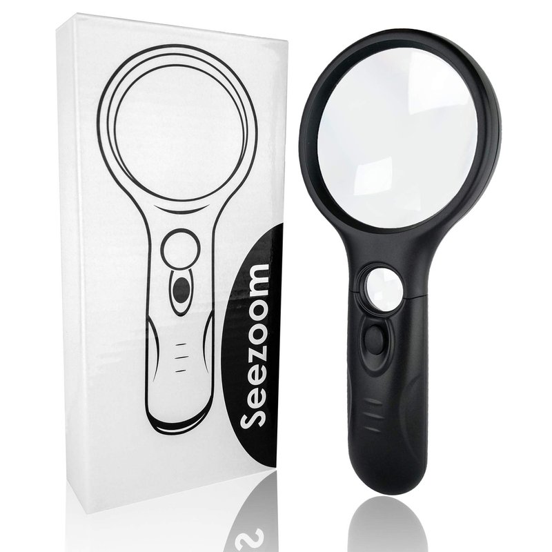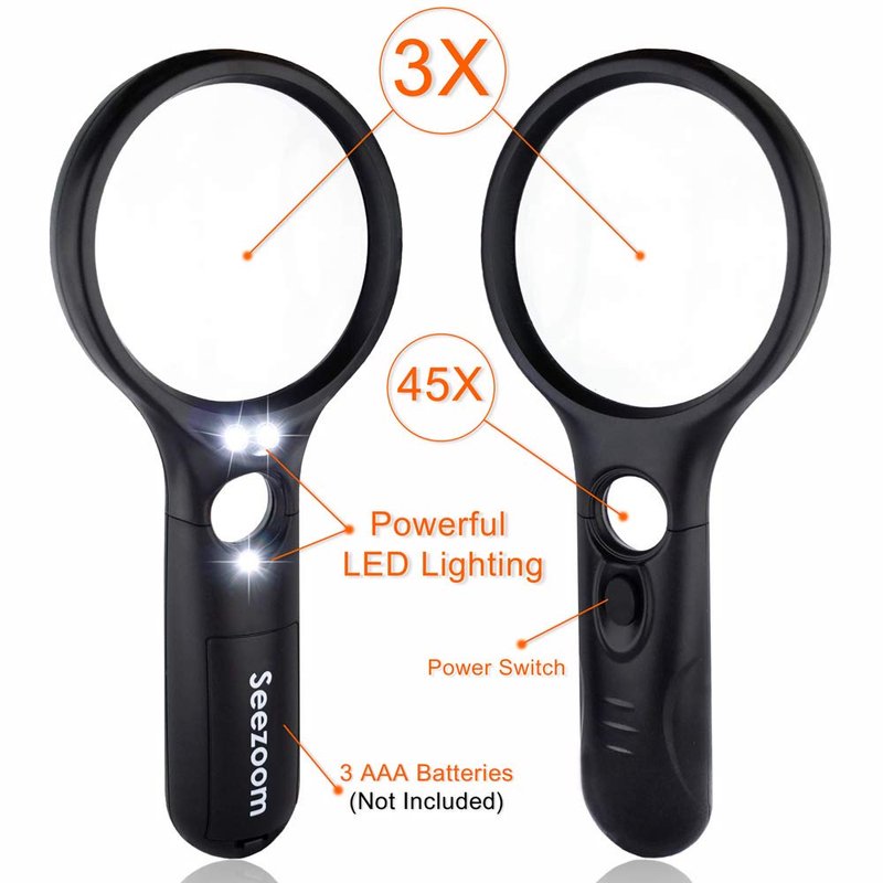 SeeZoom Lighted Magnifying Glass 3X 45x Magnifier Lens - Handheld Magnifying Glass with Light for Reading Small Prints, map, Coins and Jewelry - LED Magnifying Glass