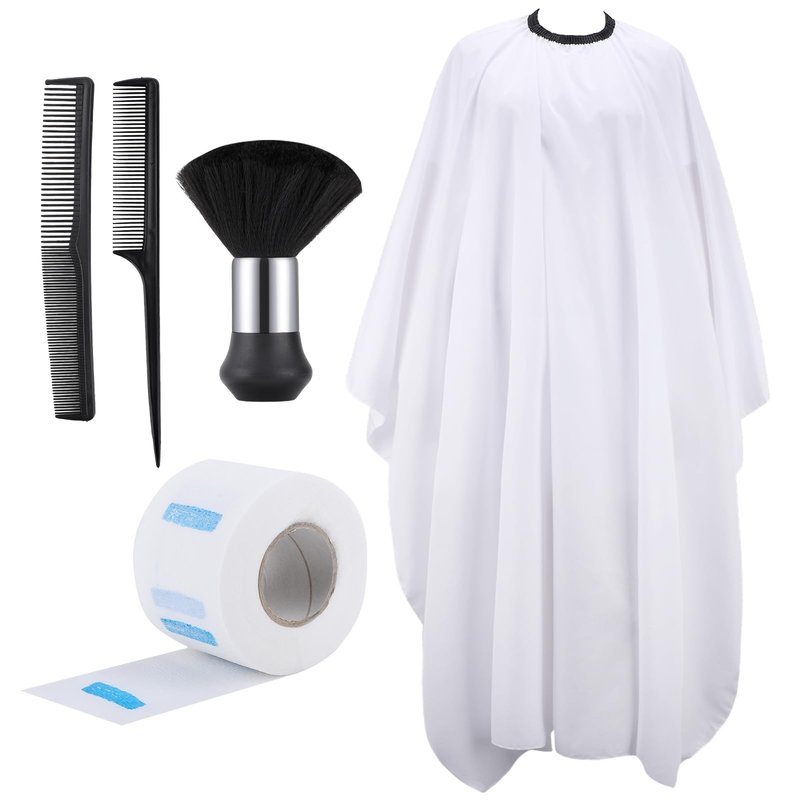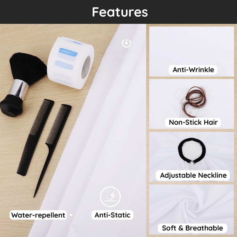 Package List: Includes 1x white haircut cape(55x63inch/140x160cm) with adjustable neck, 1x duster brush, 2x combs, 80pcs neck straps.
