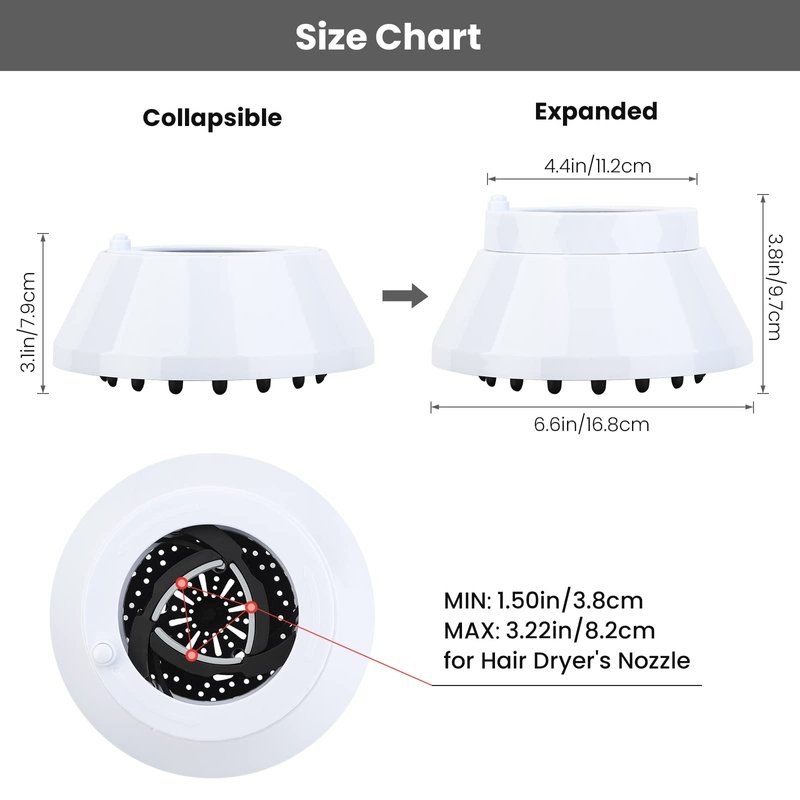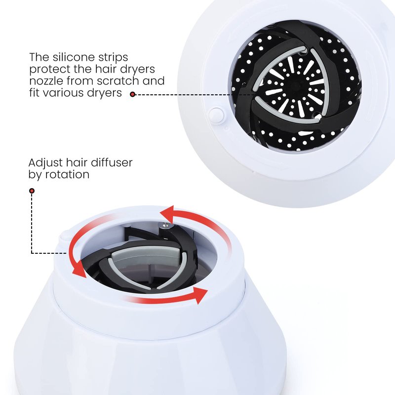 - 【Universal Diffuser--Fits over 99% Dryer on the Market】It is suitable for blow dryers with 1.50-3.22inch/3.8-8.2cm nozzle. This diffuser has a rotary locking mechanism that enables you to adjust its opening to fit any dryers that you have. NOTE---Blow dryers over 2000W with AC fans motor, DC motor or on high settings are not recommended for use with the diffuser. Please using the diffuser on low heat/low speed setting at first.