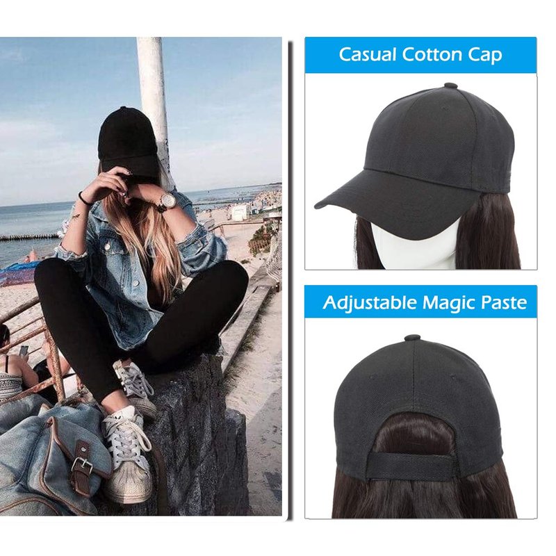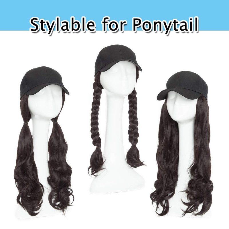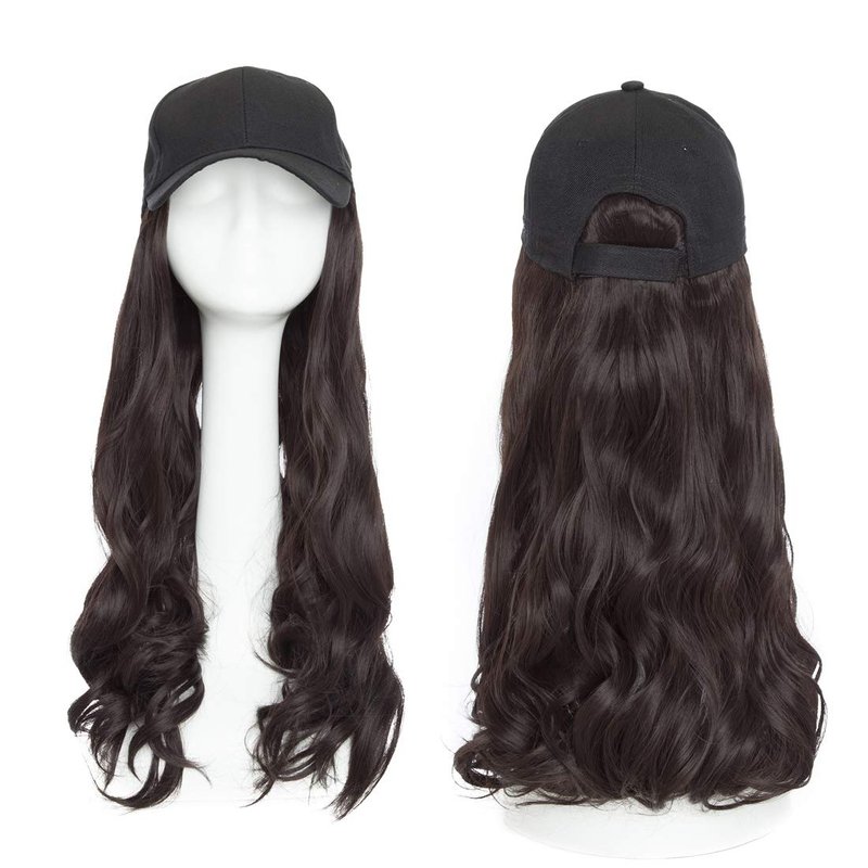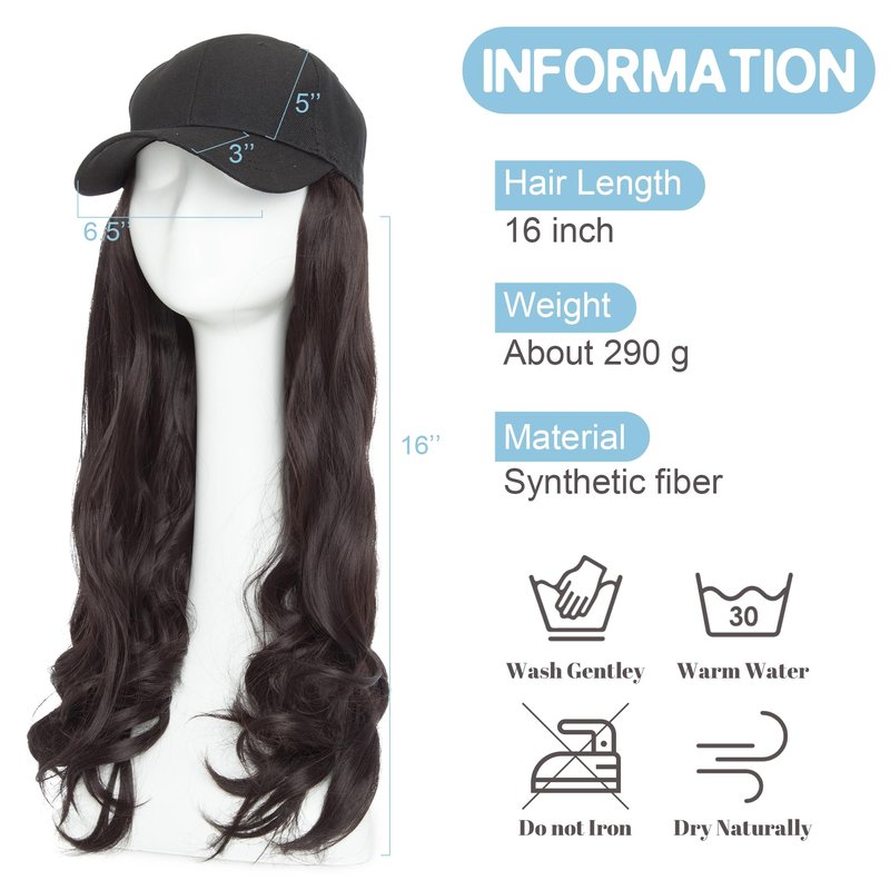 SEGO Baseball Cap with Hair Extensions for Women Adjustable Hat with Hair Attached Synthetic Long Wavy Wig with Black Hat Stylable for Pigtail Ponytail 16 Inch Dark Brown 290g