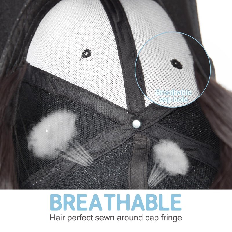 - Cotton made black baseball hat with hair attached.All hair is sewed on the brim,leaving the lining breathable for more comfort.Cool in summer! Adjustable magic paste makes it easy to find your proper size.Cap size:6.5" for diameter.5" for height.3" for the length of peak.