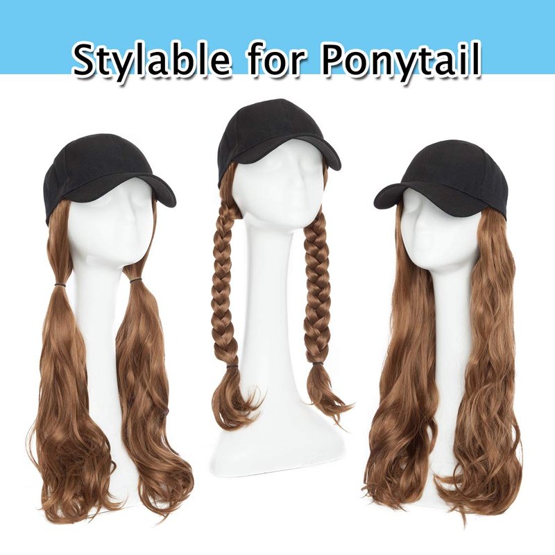 SEGO Baseball Cap with Hair Extensions for Women Adjustable Hat with Hair Attached Synthetic Long Wavy Wig with Black Hat Stylable for Pigtail Ponytail 16 Inch Light Brown 290g