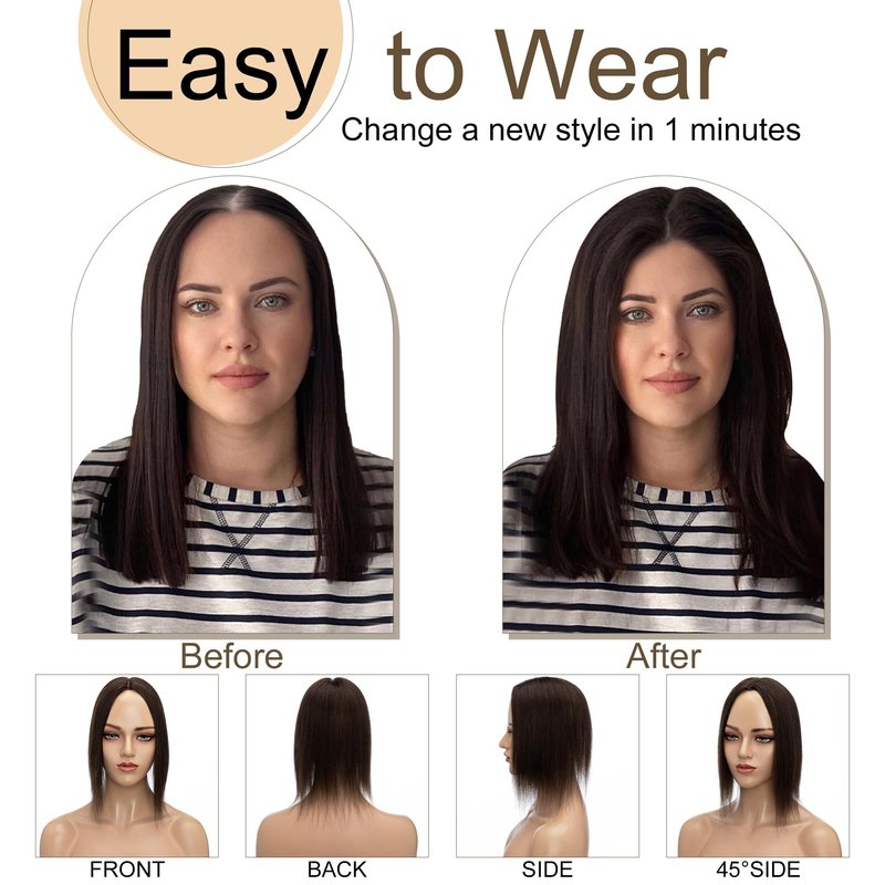 - ♛130% density♛ Compared to 100% density, 130% straight topper hairpieces is thicker and more durable as well as can last longer. Clip in hair piece has dense hairline and close. Mainly cover the top and side, less focus on backside.