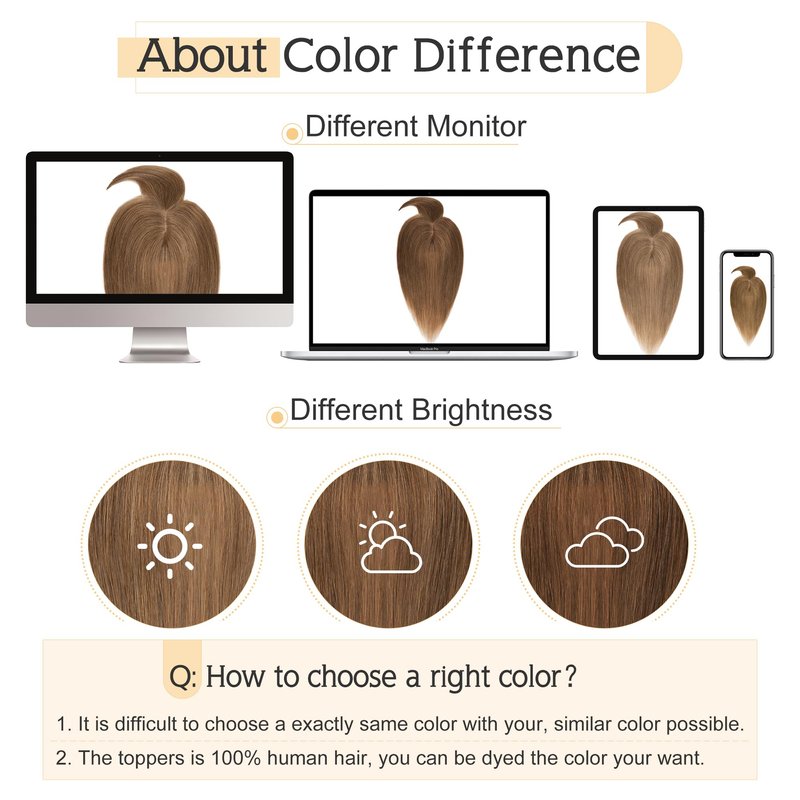 - ♛About color difference♛ Color might be slightly different from the picture showed considering light and different monitor. But since it’s real human hair, the topper can be dyed to the exact color you want if needed.