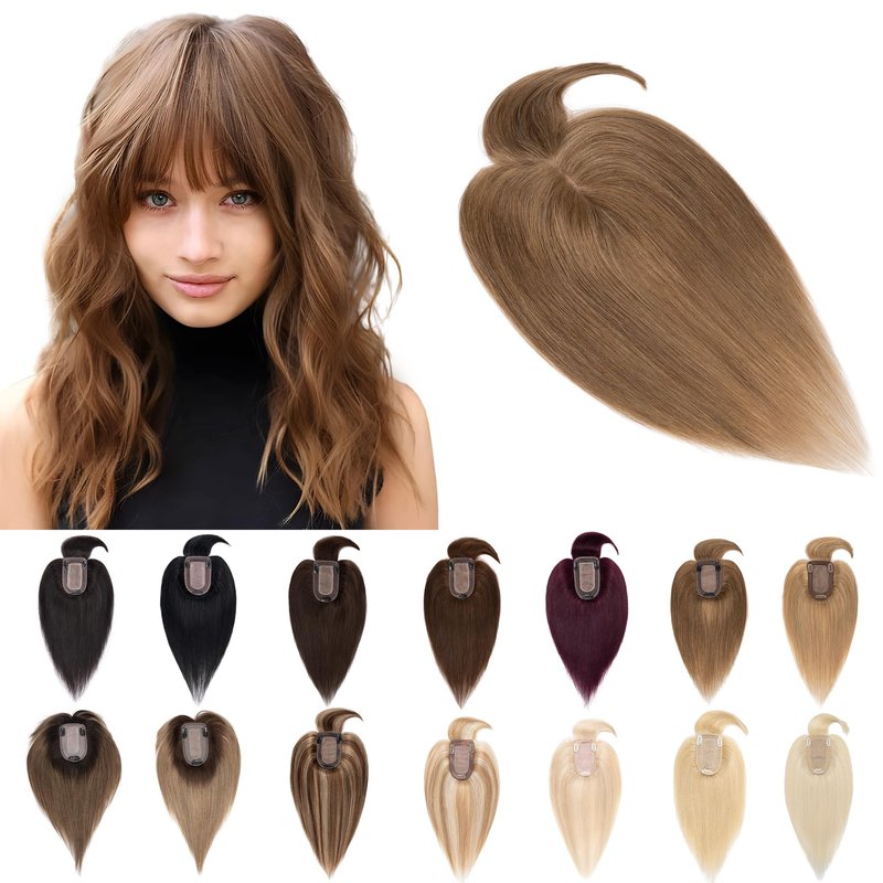 SEGO Hair Toppers for Women Real Human Hair With Bangs 7 * 13CM Silk Base 100% Remy Human Hair Clip in Top Wiglet Hair Pieces for Thinning Hair -18 Inch Light Brown
