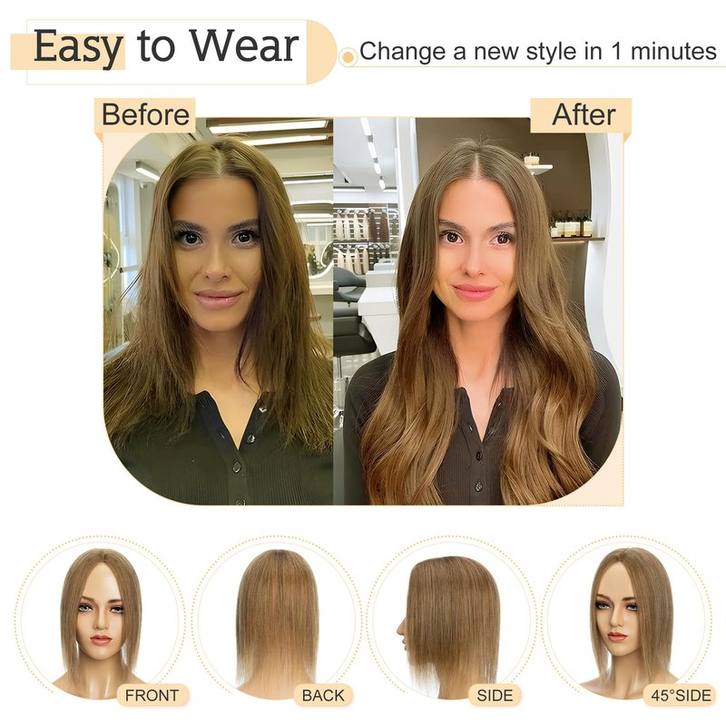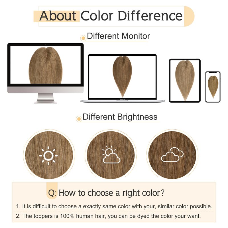 - ♛About color difference♛ Color might be slightly different from the picture showed considering light and different monitor. But since it’s real human hair, the topper can be dyed to the exact color you want if needed.