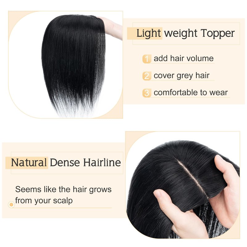 - ♛100% real human hair topper♛ Shedding and tangle free, no synthetic mix, no animal fabric mix, can be washed, dyed, curled and straightened. (Avoid ironning the hair with high temperature-advise 100-120 degree)