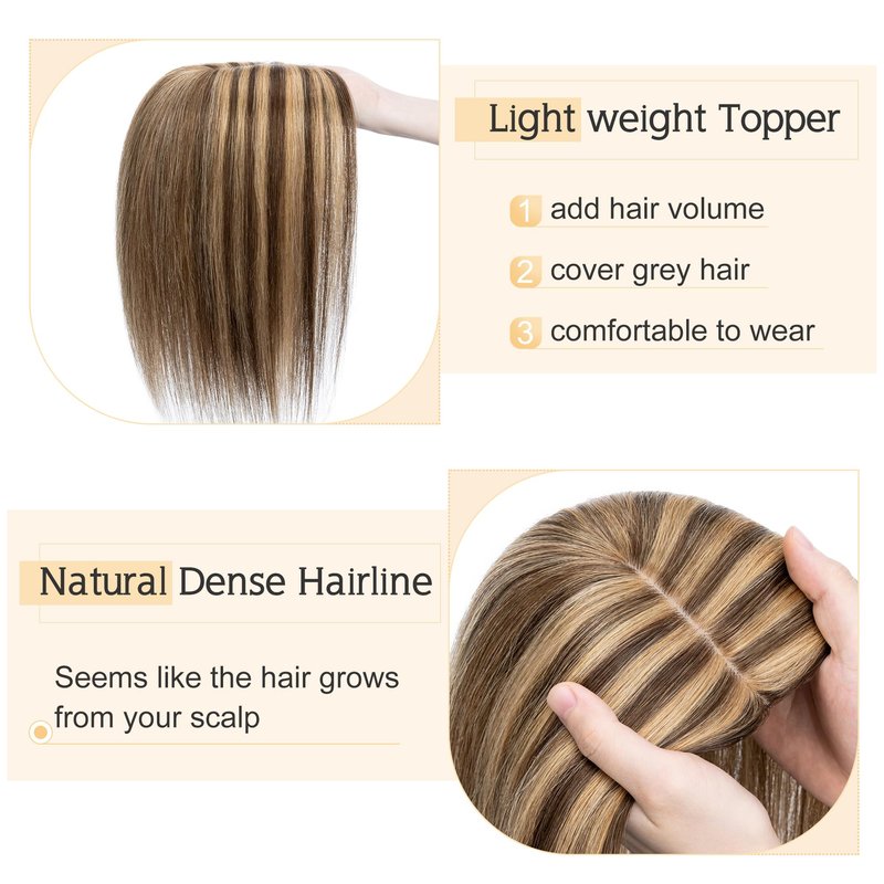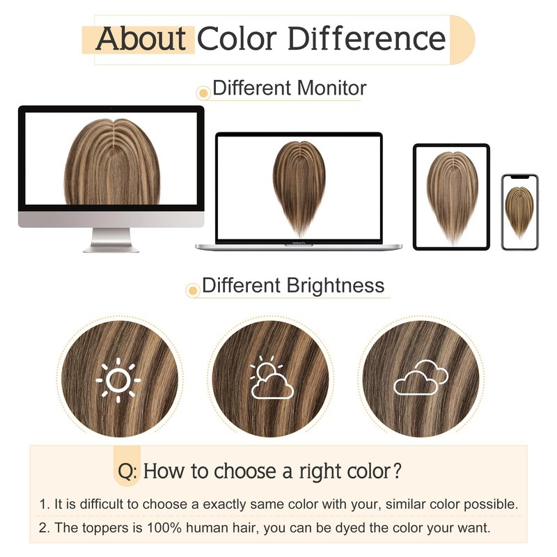 - ♛About color difference♛ Color might be slightly different from the picture showed considering light and different monitor. But since it’s real human hair, the topper can be dyed to the exact color you want if needed.