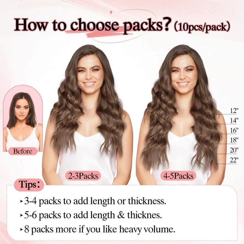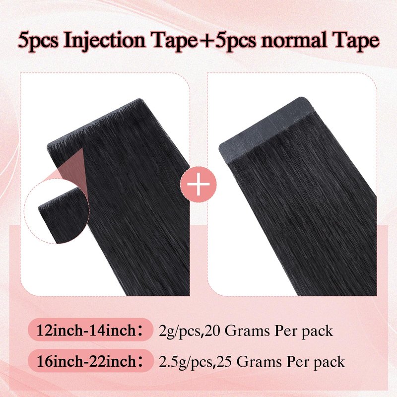 - Weight and length: Length: 12-22 inches, 12-14 inches: 5 pieces of invisible injection hair extension tape, 10g, 2g/piece, 5 pieces of normal, 10g, 2g/piece; 16-22 inches: 5 pieces of invisible injection, 12.5g, 2.5g/piece, 5 pieces of normal, 12.5g, 2.5g/piece; Replacement hair extension tape * 12.