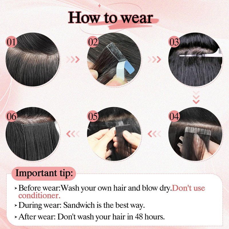 - Multiple Styling Support: You can do any hairstyle you like, invisible tape hair extensions have more outstanding styling support. It can be dyed, straightened or curled with hot tools, just like your own hair, but be careful not to use hot tools at a temperature exceeding 180℃.