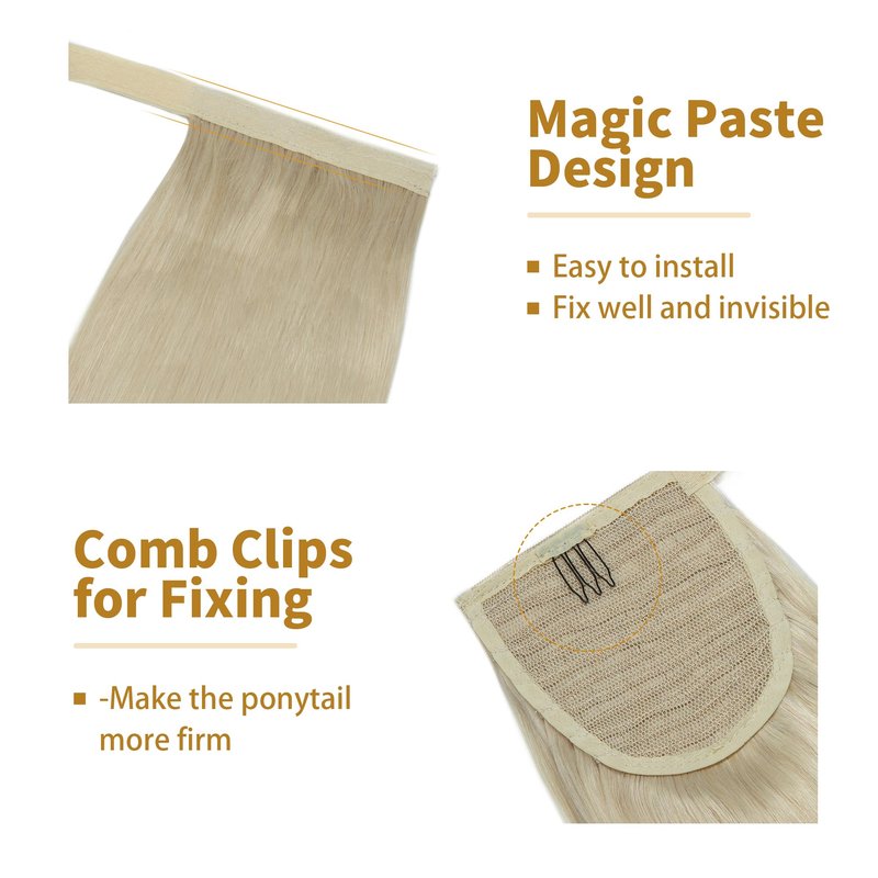 - ♛Super Easy to Wear ♛—Wrap around ponytail hairpieces, easy to wear and take off by yourself, no damage to your own hair. With the magic paste design, it’s convenient and can save you time. Just wrap it around your ponytail and clip in! Quick way to instantly add length and volume to your ponytail.