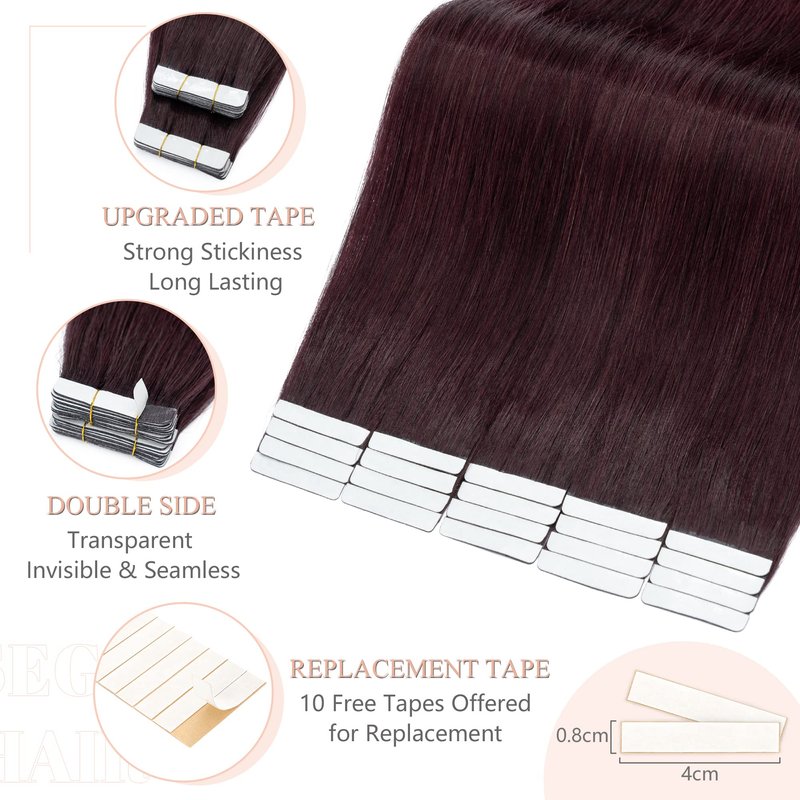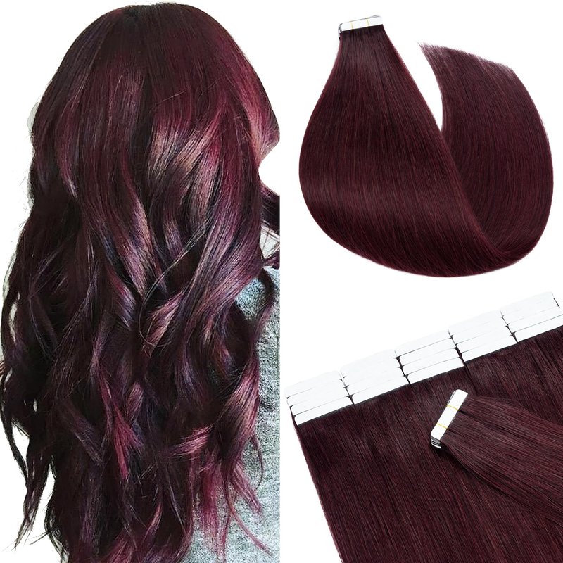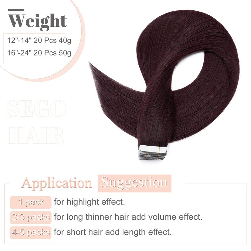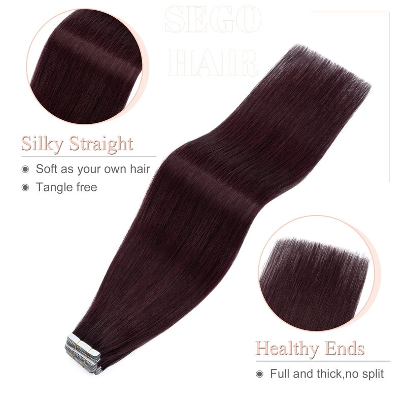 SEGO Tape in Hair Extensions Human Hair 16 Inch 50g 20pcs Natural Straight 100% Remy Rooted Seamless Skin Weft Invisible Double Sided Tape Hair for Women-Wine Red