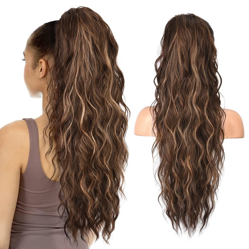 SEIKEA 26" Highlight Ponytail Extension,PT003 Eva Long Drawstring Ponytail Wavy Clip in Hair Extensions Ponytail Natural Soft Synthetic Hairpiece for Women Chocolate Brown with Blonde Highlights