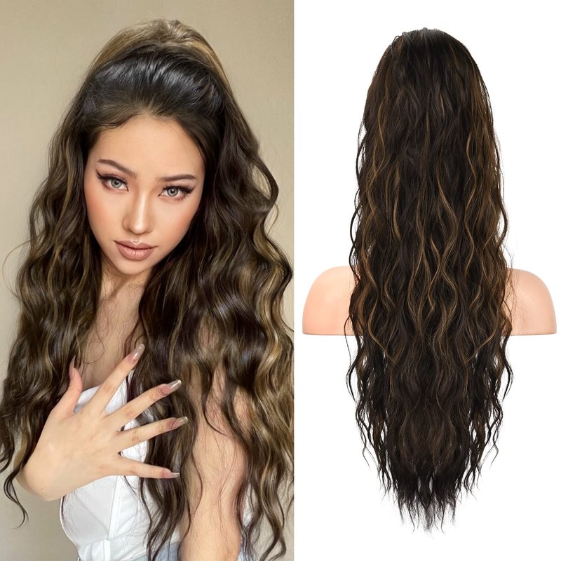 SEIKEA 26" Highlight Ponytail Extension,PT003 Eva Long Drawstring Ponytail Wavy Clip in Hair Extensions Ponytail Natural Soft Synthetic Hairpiece for Women Deep Brown with Auburn Highlights