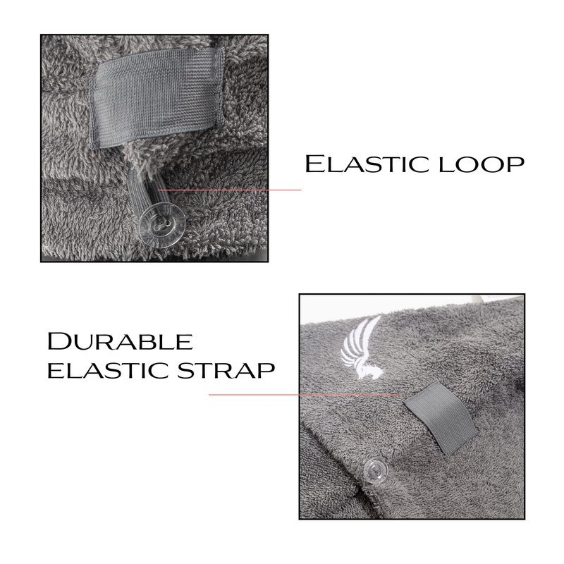 - BEST FOR ALL HAIR TYPES: 26x10 inches. Easy to wrap and use. You can use it while doing make-up, working on computer or getting dressed. Protect your hair health. Great for home, travel, workout or pool. 100% Cotton hair towel wrap for curly, wavy, long or thick hair. UNIQUE LOOP SYSTEM Our towels have an elastic loop and extra elastic strap (made of high-quality materials) to keep your hair in place. Our towels are more durable, more absorbent and last longer than other towels in the market.