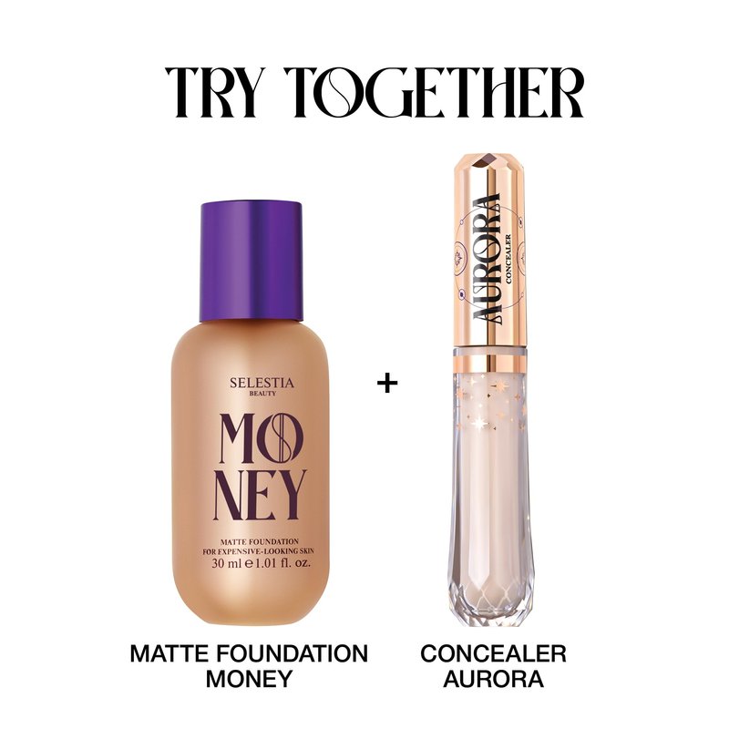 The main secret of perfect matte expensive-looking skin is highest rated makeup from Selestia Beauty. Flawless coverage and smooth, even skin, weightless texture, amazing matte finish, and unmatched durability. The Money water based foundation flawlessly hides all imperfections and leaves no chance for an oily sheen. The silky soft texture of foundation for mature skin and young skin glides on and spreads over the skin for a natural finish without a mask effect. 8 shades for different skin types: 01 Ivory - Ivory with beige undertone, 02 Vanilla - Nude beige with golden Undertone, 03 Cloud - Beige with peach undertone, 04 Almond - Medium beige with sand undertone, 05 - Honey - Medium deep with warm undertone, 06 - Caramel - Medium deep or light tan skin tones with yellow undertone, 07 - Mocha - Deep skin tones with yellow undertone, 08 - Truffle - Deepest skin tones with neutral undertones.