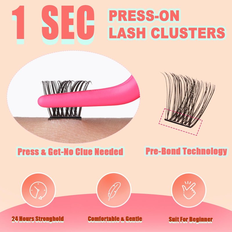 - PRE-BOND TECHNOLOGY: No glue lashes press on falsies lashes clusters kit for those of you who can't use liquid lash glue, it's amazing.just one step, press on, and enjoy beautiful lashes in seconds! No damage to natural lashes.
