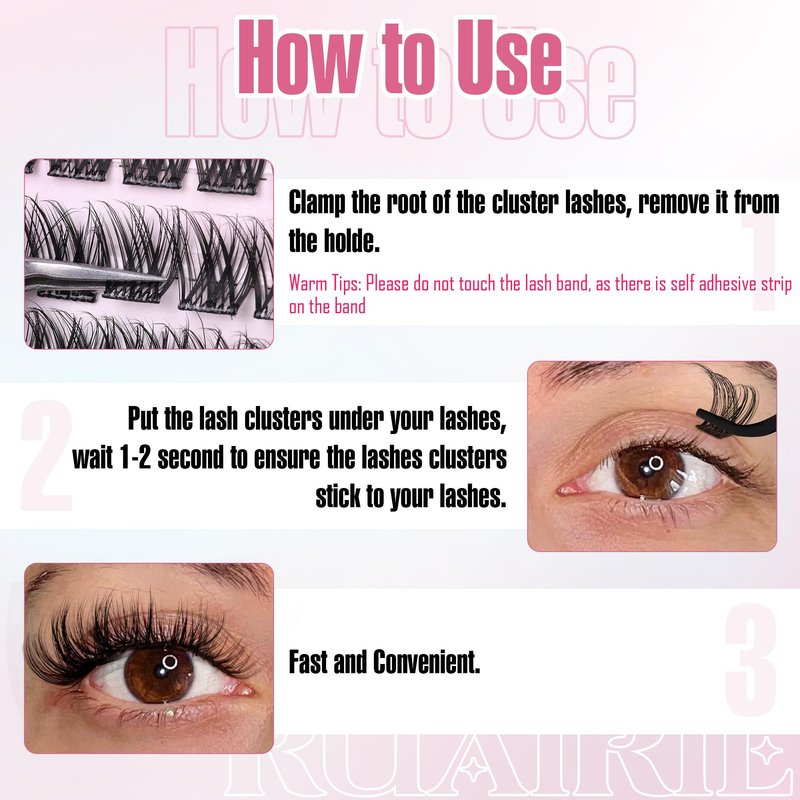 - How to use - Step1: Curl your lashes if necessary, clamp the root of cluster lashes, remove it from the holder (Warm Tips: Please do not teach the lash band,as there is self adhesive strips on the band) Step2: Put lash clusters under your lashes, let the adhesive strip perfectly fit the base of your eyelashes, press lightly to ensure the diy eyelash extension firmly well