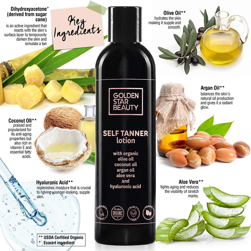 - 🌟COMPROMISE FOR NOTHING ELSE THAN THE BEST: Made in the USA under strict quality control and featuring certified organic oils (olive oil, argan oil, jojoba oil, coconut oil, avocado oil), organic aloe vera, hyaluronic acid and intense moisturizers. Fight sunburn, early aging and reward your skin with our premium self tanner.