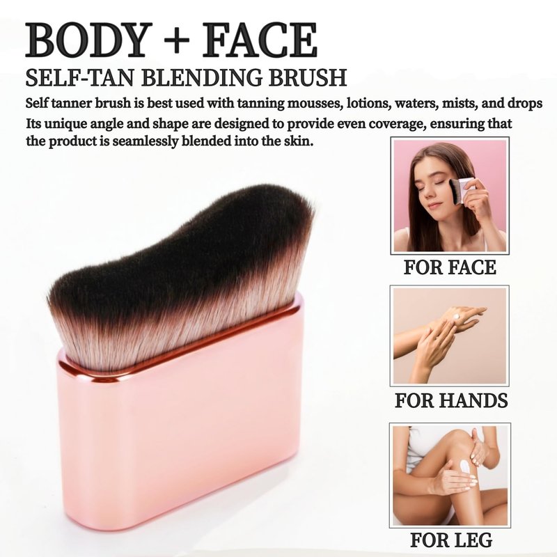 - MULTIFUNCTIONAL SELF TANNER BRUSH: Tan body brush for blend & buffing putting on any type of body shimmer/makeup, powder, cream, blush, liquid foundation, self tanner, sunless tan, tanning mousse, tan tanspray, tanning lotion, body lava, bronzer. Create a natural look quickly and accurately.