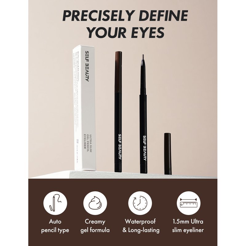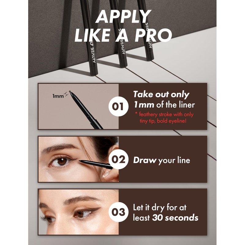 Elevate your eye game with SELF BEAUTY Ultra Slim Waterproof Eyeliner Gel in Matte Brown. Unleash the power of precision with its 1.5mm ultra-fine tip, allowing you to draw out the outer lash line with unmatched control. This twist-up retractable brown eyeliner waterproof pen ensures a gorgeously defined and winged look in just a twist, without the need for sharpening.