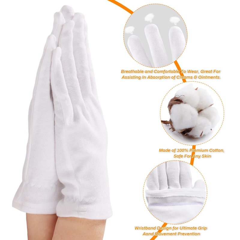 - SOFT MATERIAL: Made of 100% premium cotton fabric, these white cotton gloves are breathable and comfortable to wear, great for assisting in the absorption of creams & and ointments, treating hand eczema, moisturizing dry hands for women and men