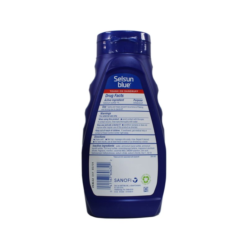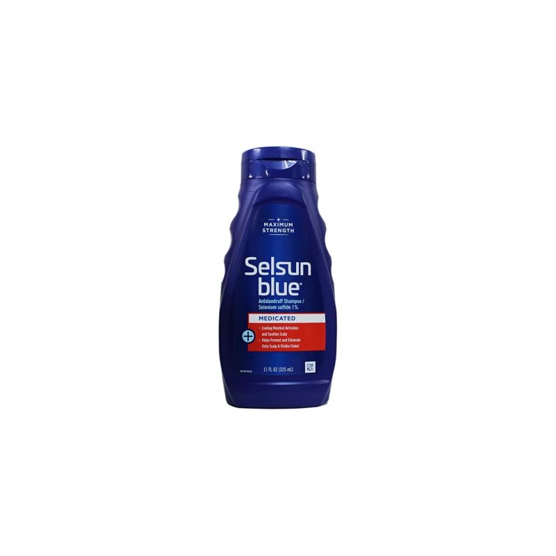 Selsun Blue Medicated Anti-Dandruff Shampoo with Menthol is formulated to provide maximum-strength relief from dandruff symptoms. Its active ingredient, 1% selenium sulfide, effectively targets and controls dandruff, helping to prevent and eliminate itching, flaking, irritation, redness, and scaling of the scalp. The inclusion of menthol delivers a cooling and soothing sensation, enhancing scalp comfort during use. This shampoo features a quick-lather formula that deeply cleanses the hair and scalp, leaving hair soft and silky. It is free from sodium lauryl sulfate (SLS), parabens, phosphates, phthalates, and silicones, making it suitable for various hair types and gentle enough for regular use.