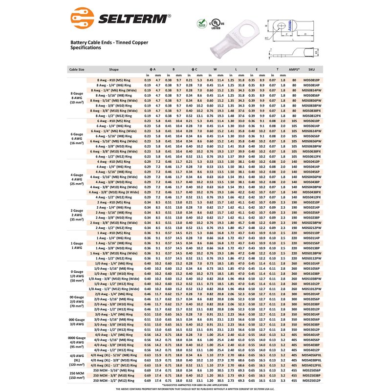 SELTERM Tinned Copper Battery Cable lugs are ideal for making Marine Grade Cables, Battery Cables & Welding Cables that are used in marine, outdoor and harsh environments. To ensure their anticorrosive properties, these lugs have been subjected to salt spray tests to ASTMB117 standard. Rigorous field testing in harsh winter environments in snow have also been conducted by OEMs that depend on these lugs. These Lugs can be crimped or soldered on and are UL & CUL listed and rated for up to 600V+, allowing use in a wide range of applications such as Boat Wiring, Trolling Motors, Car Audio, ATVs, RVs, Snowmobiles, Golf Carts, Automotive, Electric Powertrains, Off-grid Solar, Back-up Power & Battery Banks. The battery cable lugs are made from 99.9% pure seamless copper tubes that adhere to the ASTMB188 standard. The copper is malleable & ductile enough to withstand crimp force without cracking. The lugs are tin plated according to ASTMB545 standard to guarantee uniformity in the plating thickness. These copper lugs are tested to ensure they meet S.A.E conductivity standards J163 & J1811. The barrels of the lugs have flared end to ensure easy cable entry. The pads of the lugs are properly sealed at the ends to prevent any moisture or solder from leaking. Wire & stud sizes are clearly marked on the pads for easy identification during installation. The copper wire lugs are RoHS & REACH compliant.