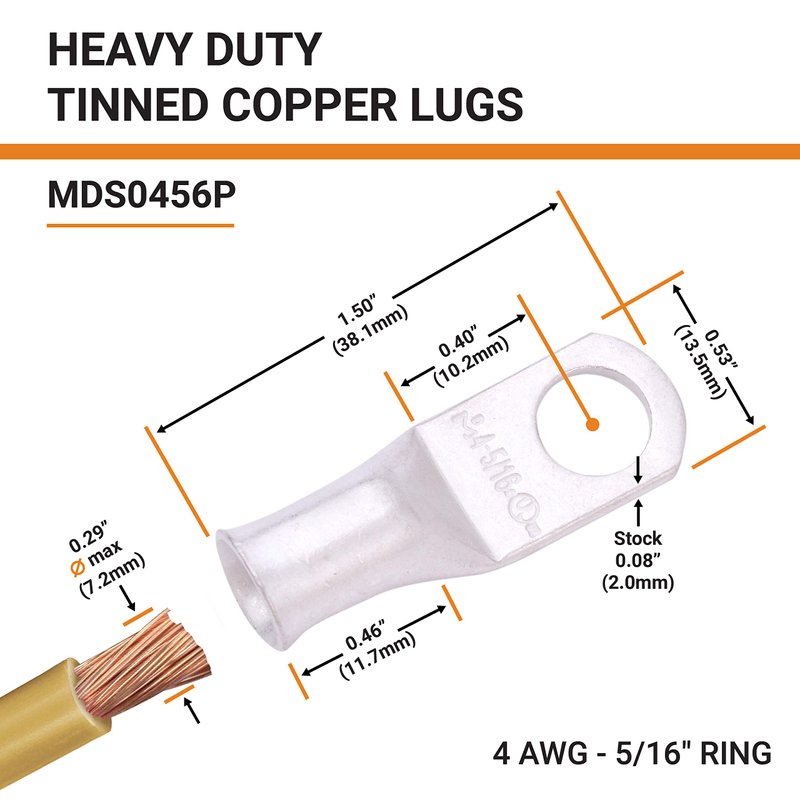 - PACKAGE CONTENTS - 25 PCS. of Marine Grade Tinned Copper 4 Gauge (AWG) 5/16" ring battery cable lugs / terminal connectors. 100% annealed tinned copper, providing a high degree of conductivity for maximum current flow when used as battery terminals.