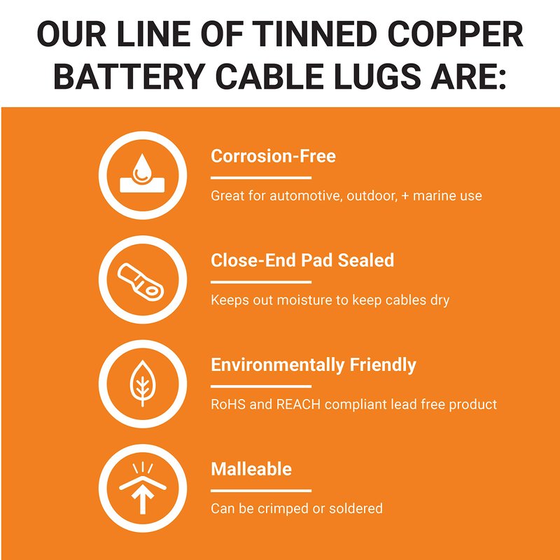 - DURABILITY - Approved by OEMs, our Tinned Copper wire ring connectors are corrosion free; ideal for marine, automotive or outdoor use; salt spray tested to ASTMB117 standard. Special matte tin plating make these copper cable lugs as easy to Solder as it is to Crimp.