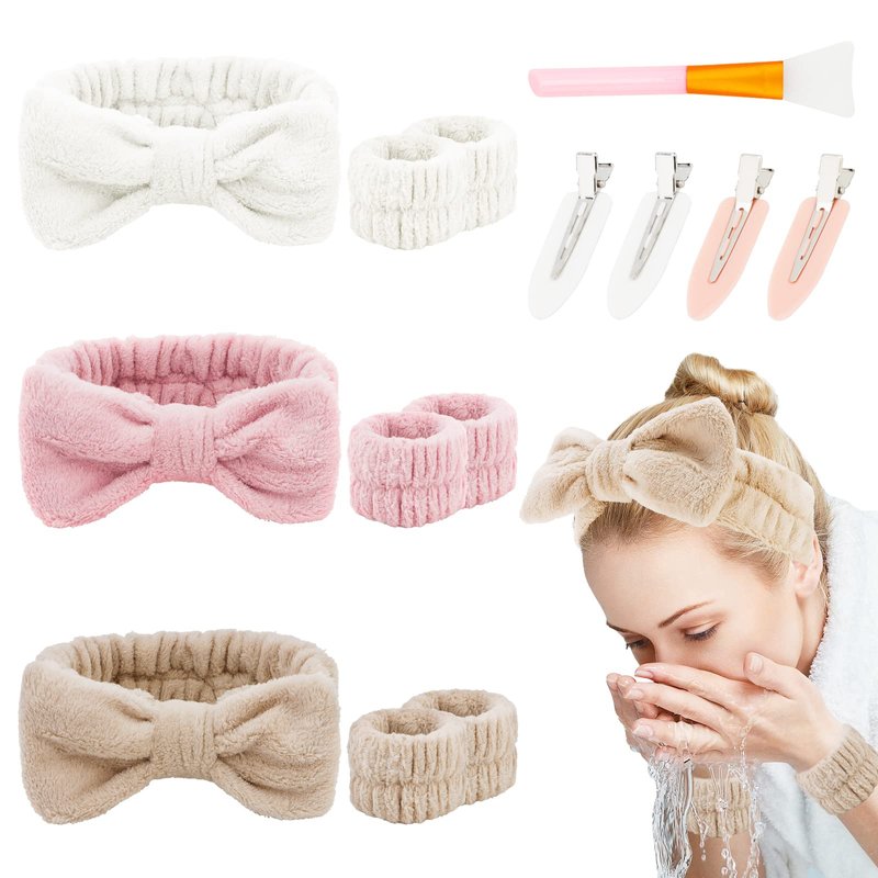 - Package included: 3 coral fleece headbands for washing face, 3 pairs of wrist bands, 4 no crease hair clips and 1 silicone face mask brush
