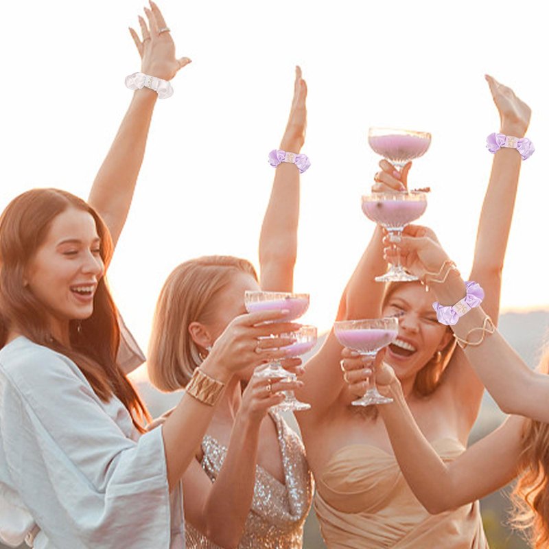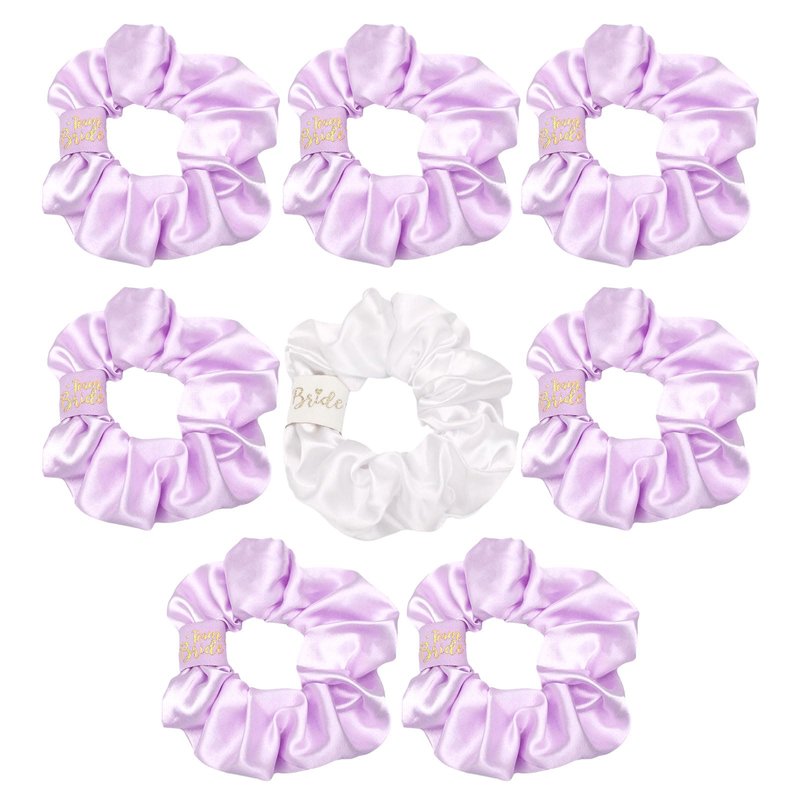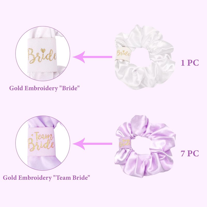 - Bachelorette party favors set: You will receive 8 pieces of satin scrunchies ,including a white one embroidered with "bride" in gold and 7 pcs purple embroidered with "team bride" for bridesmaid