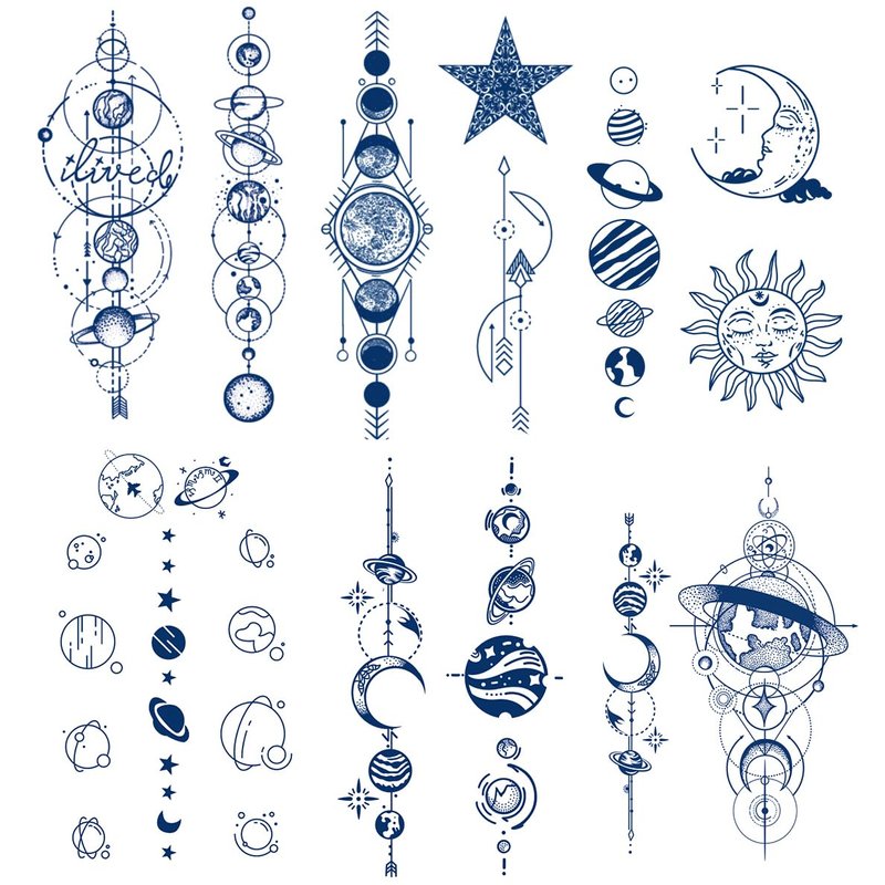 Semi Permanent Planet Temporary Tattoos, 6-Sheet 2 Weeks Long Last Waterproof Moon Star Sun Tattoos, 100% Plant-Based Ink Infinity Realistic Tattoos Sticker
