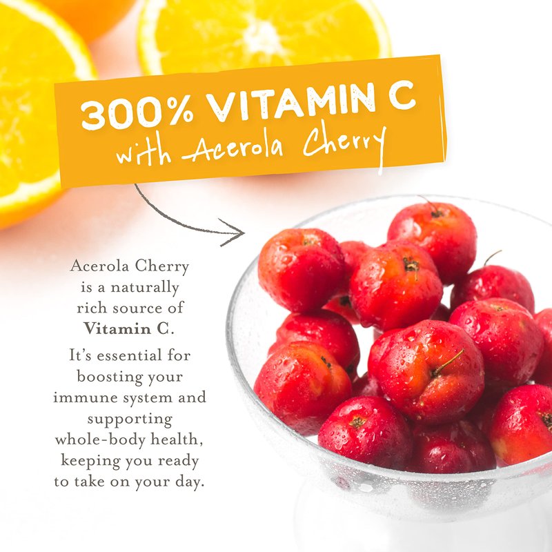 - 300% Vitamin C With Acerola Cherry; Acerola cherry is a naturally rich source of Vitamin C. It can boost your immune system and support whole-body health, keeping you ready to take on your day.