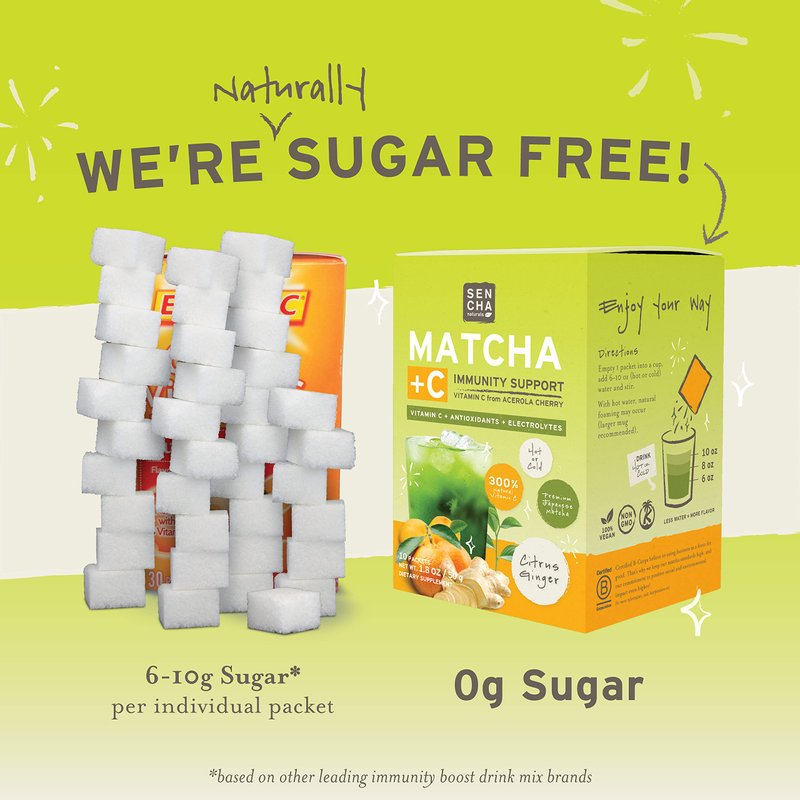 - Sugar Free; Our sencha green tea drink with Vitamin C is sugar free. Plus, it is super easy to use. Simply empty 1 pack into a cup, add 6-10 oz of hot or cold water, and stir. Less water = more flavor.
