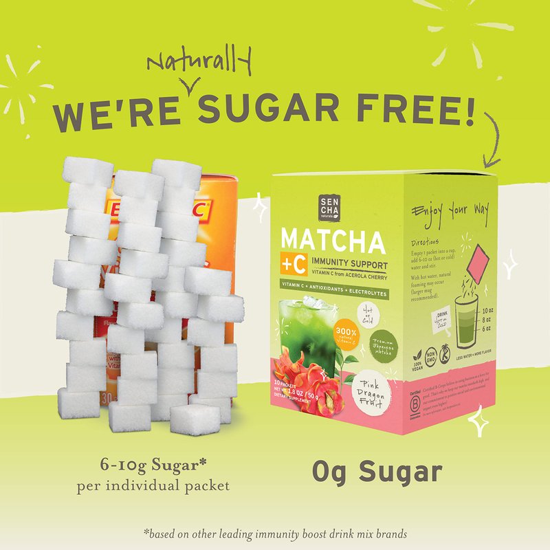 - Sugar Free; Our sencha green tea drink with Vitamin C is sugar free. The exotic dragonfruit flavor has a tangy, yet slightly sweet flavor profile that we think tastes extra amazing over ice. Less water = more flavor.