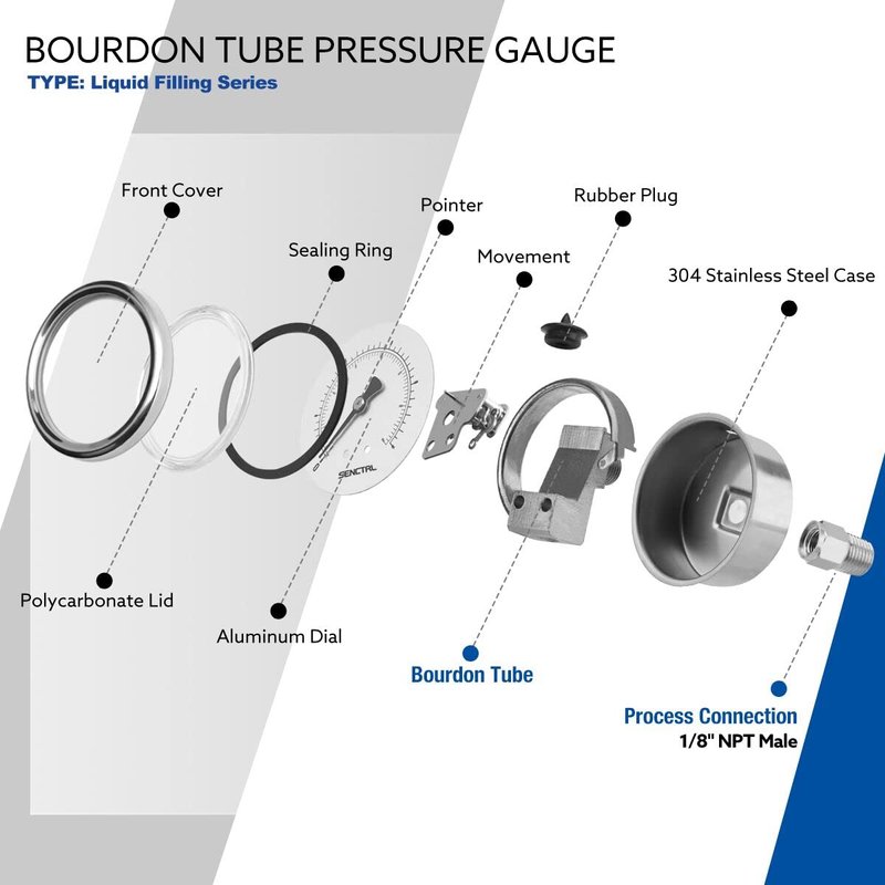 - Circular dial is enclosed in a 304 stainless steel case for corrosion resistance. Liquid filled inhibits pointer flutter and prevents damage to the internal mechanics from vibration and pulsation.
