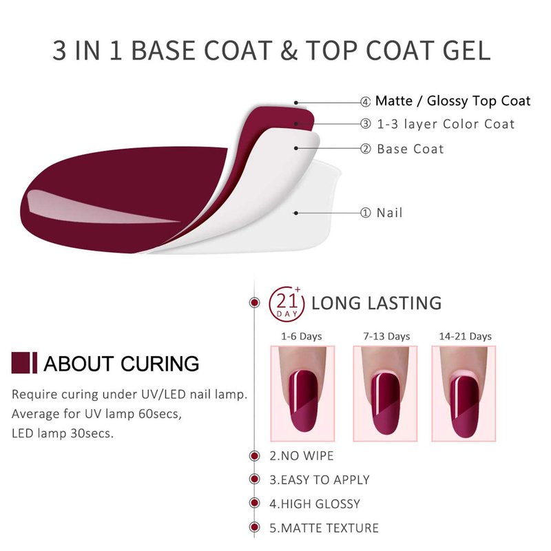 - EASY APPLICATION & LONG LASTING: First use the base coat and cured by led lamp, Second apply color coat and cured, apply top coat and cured by led lamp, DONE! It is long lasting for 21+ days under proper application.